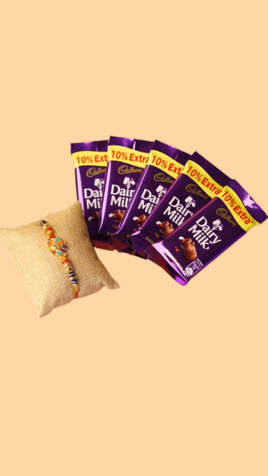 Celebrate Raksha Bandhan with this simple yet sweet combo from Yasvi. Featuring a beautiful handcrafted Rakhi and 5 Dairy Milk chocolates (₹10 each), this combo is perfect for spreading love, smiles, and chocolatey happiness this festive season.